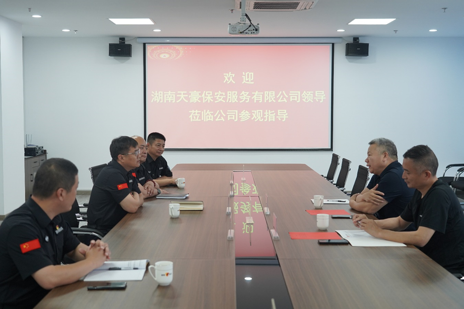 5月27日,湖南天豪保安服務(wù)有限公司董事長趙士友、總經(jīng)理吳燦光蒞臨我公司交流工作,公司黨委書記、董事長付志欣,黨委委員、副總經(jīng)理丁德鵬,黨委委員、副總經(jīng)理王成,辦公室主任范丙磊陪同。
