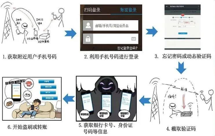在公眾的印象中,“隔空取物”一般出現(xiàn)在魔術(shù)表演節(jié)目或仙俠小說的橋段中。其實(shí),此類無觸式隔空盜刷現(xiàn)身于世的時(shí)間并不長,屬于新型電信詐騙案件,其工作原理說起來也并不復(fù)雜。我們?nèi)粘J褂玫脑S多App登錄及操作,都可以通過手機(jī)號碼加短信驗(yàn)證碼的方式實(shí)現(xiàn),而手機(jī)號碼和短信內(nèi)容可以通過專用電子設(shè)備來獲取。即,作案人員首先使用偵碼設(shè)備獲取一定范圍內(nèi)用戶的手機(jī)號碼和短信內(nèi)容,然后利用獲取的手機(jī)號登錄支付平臺,再用嗅探設(shè)備獲取手機(jī)驗(yàn)證碼,最后登錄平臺操控用戶資金賬戶進(jìn)行轉(zhuǎn)賬或消費(fèi)。