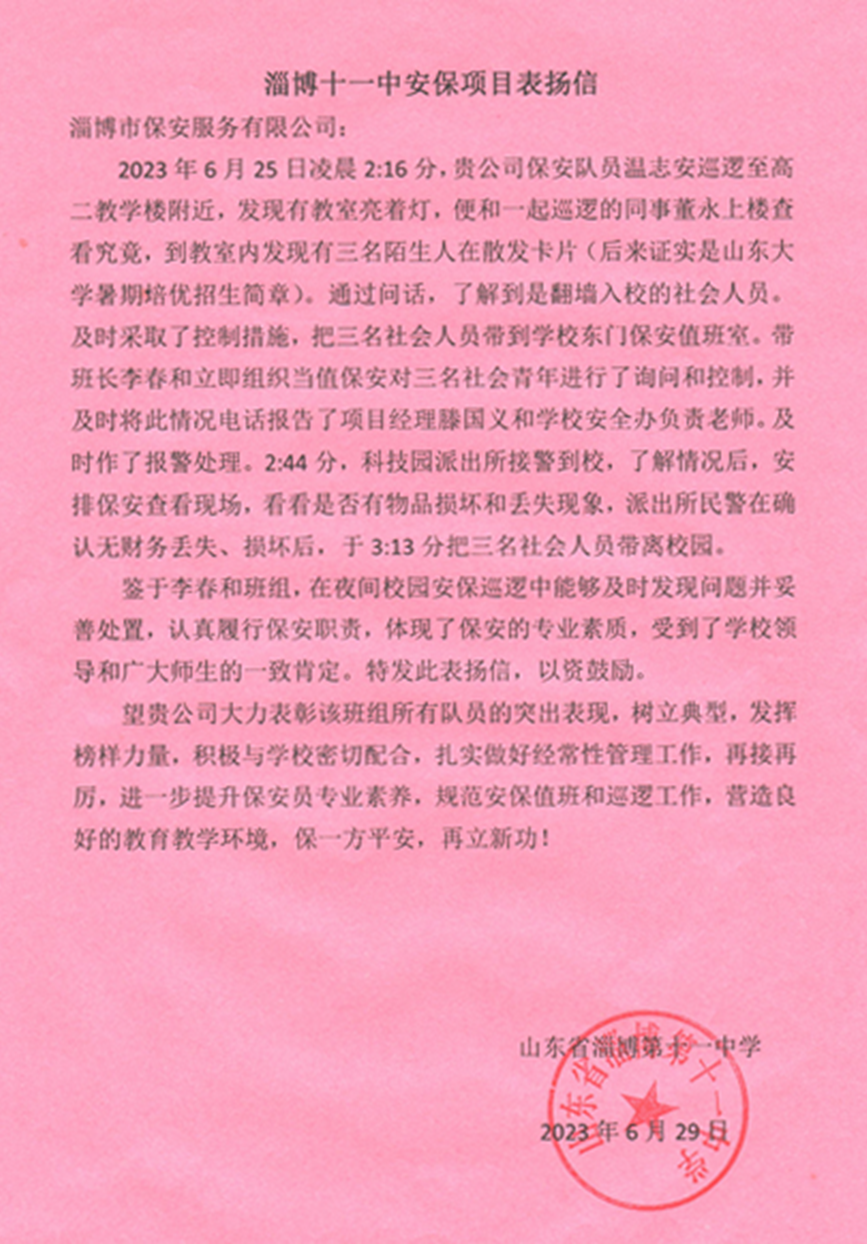 近日,淄博市校園安保抓到三名社會人員翻墻入校散發(fā)暑期培優(yōu)招生簡章,及時(shí)采取控制措施并報(bào)告校方安辦負(fù)責(zé)人,同時(shí)進(jìn)行報(bào)警處理。得到了校方的一致好評,并送上了表揚(yáng)信。